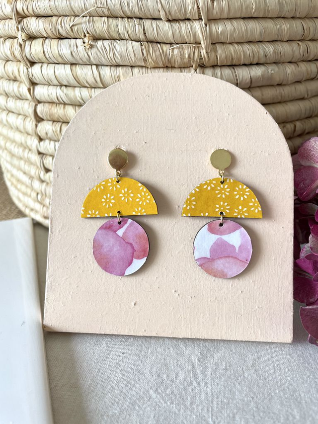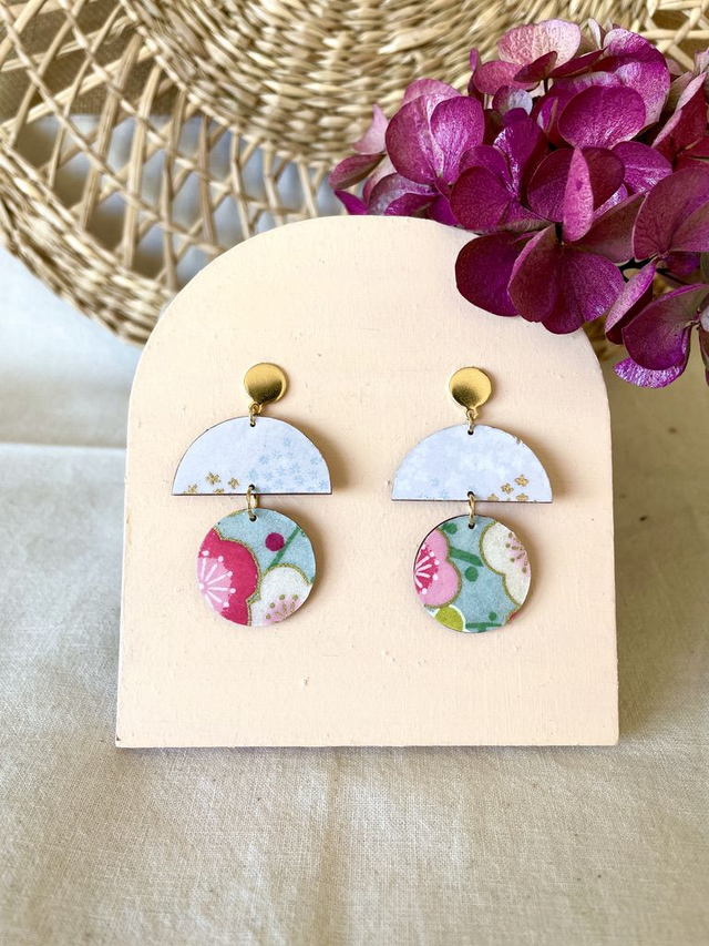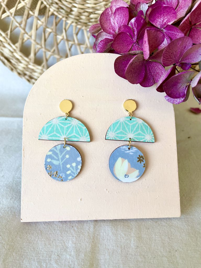Paire de boucles d'oreilles composées d'un cercle et d'une demi lune de bois décoréss de papiers origami colorés à motifs variés, et recouverts d'un vernis de protection transparent. Les crochets sont en acier inoxydable finition dorée ou argenté.