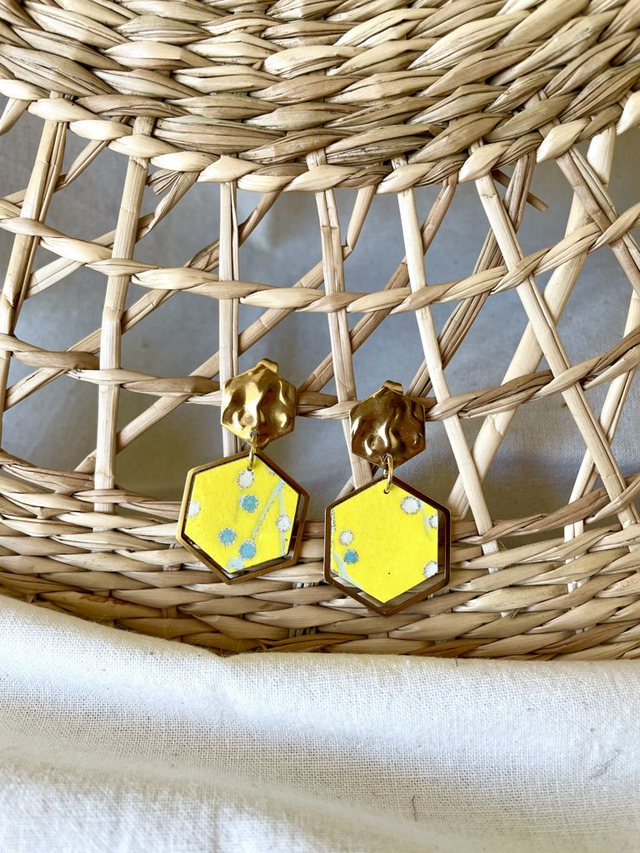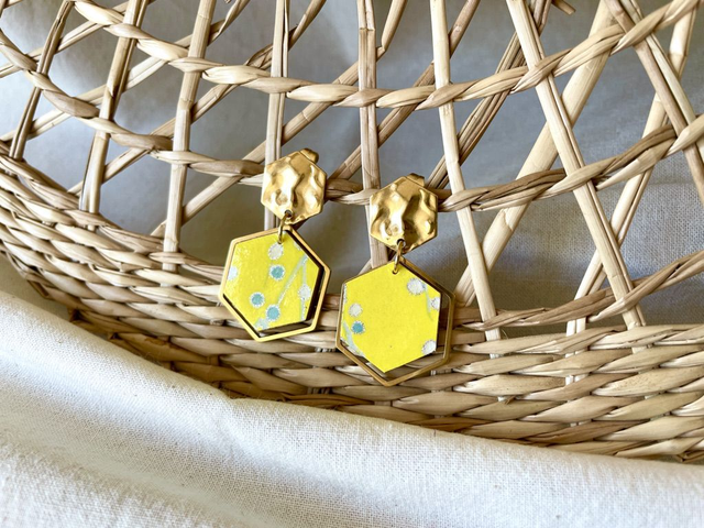 Ajoutez une touche unique et raffinée à votre tenue avec ces boucles d'oreilles faites à la main. Fabriquées à partir de bois léger recouvert de papier origami aux motifs délicats et colorés, elles associent créativité et légèreté. Les apprêts en acier inoxydable dorés à l'or fin garantissent une finition durable et hypoallergénique, parfaite pour toutes les peaux.