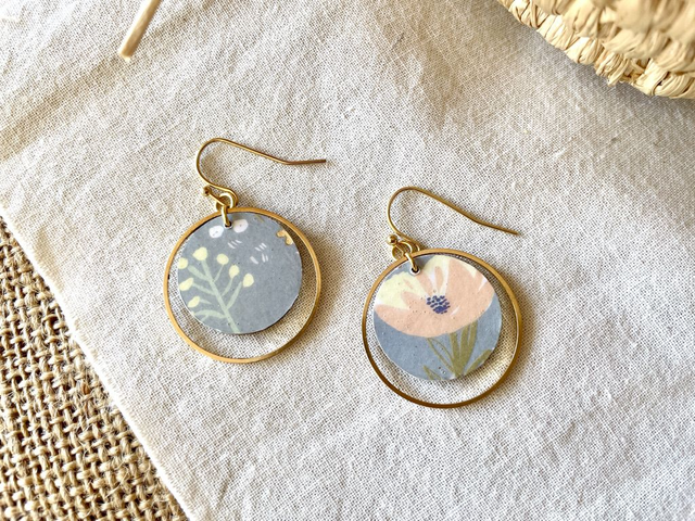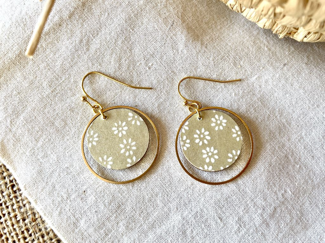 Paire de boucles d'oreilles puces taille moyenne, composées de 2 cercles de bois, recouverts de papiers origami colorés à motifs recouvertes d'un vernis de protection transparent.