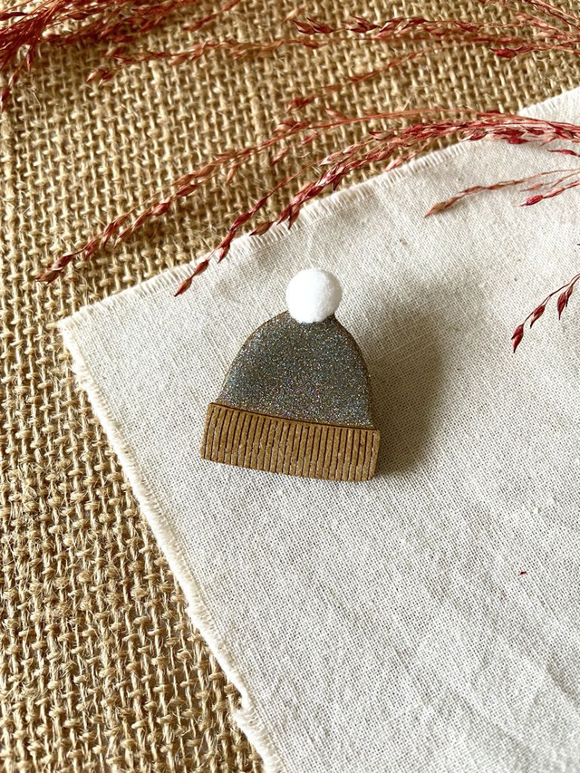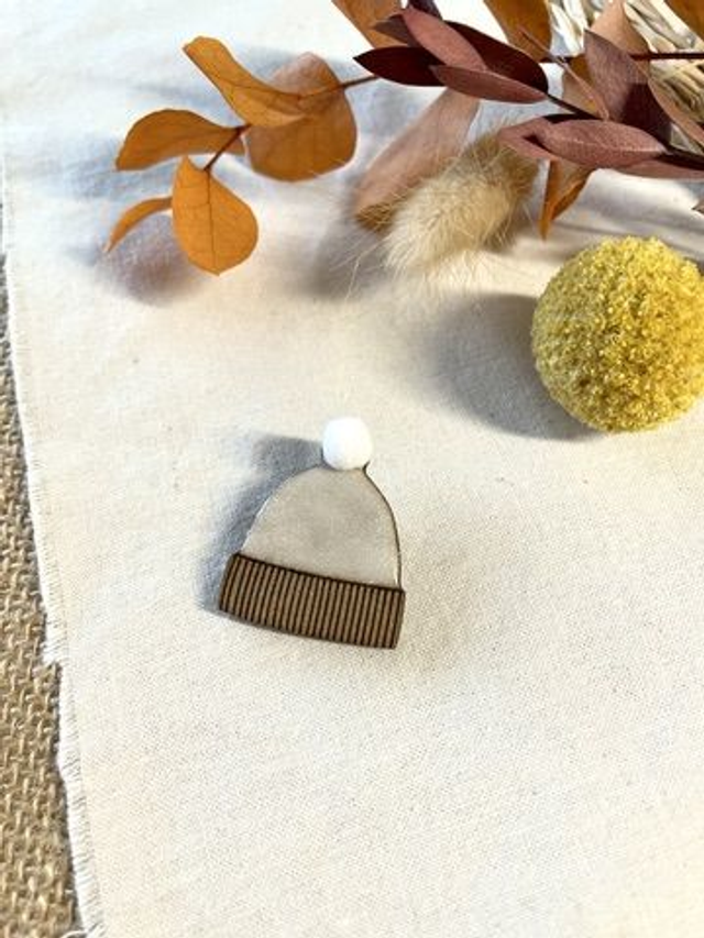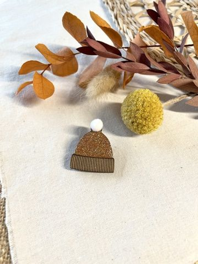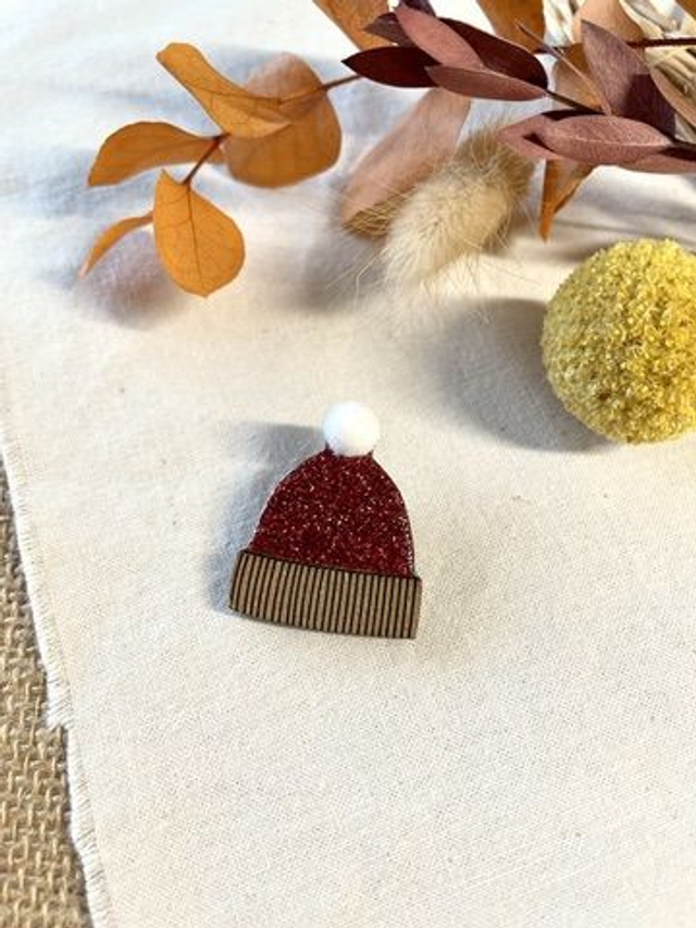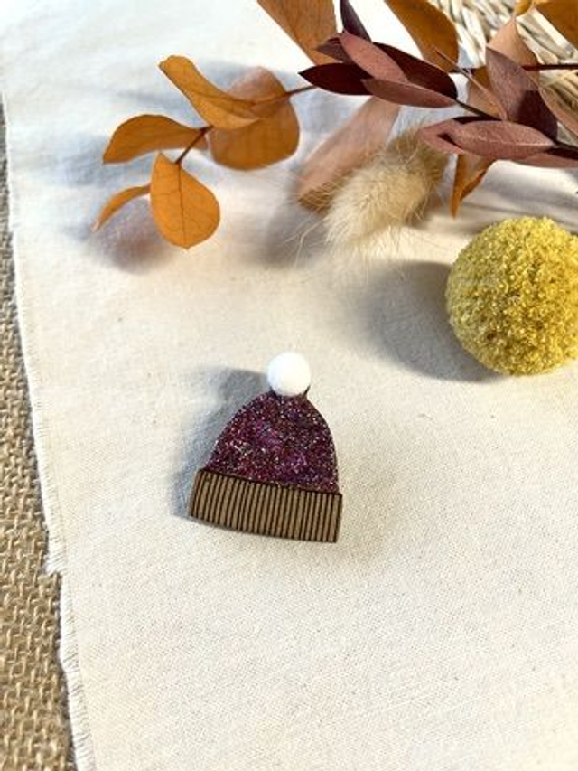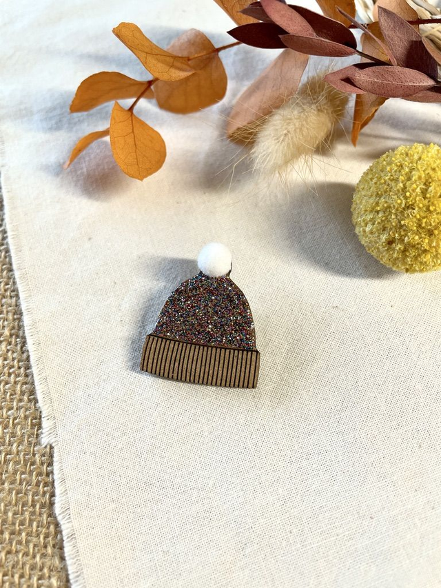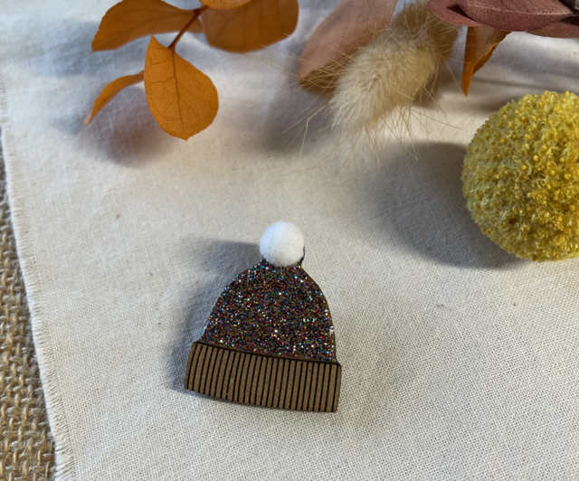 Broche bonnet d'hiver en bois découpé et gravé au laser, décorée par de jolis papiers origami colorés.