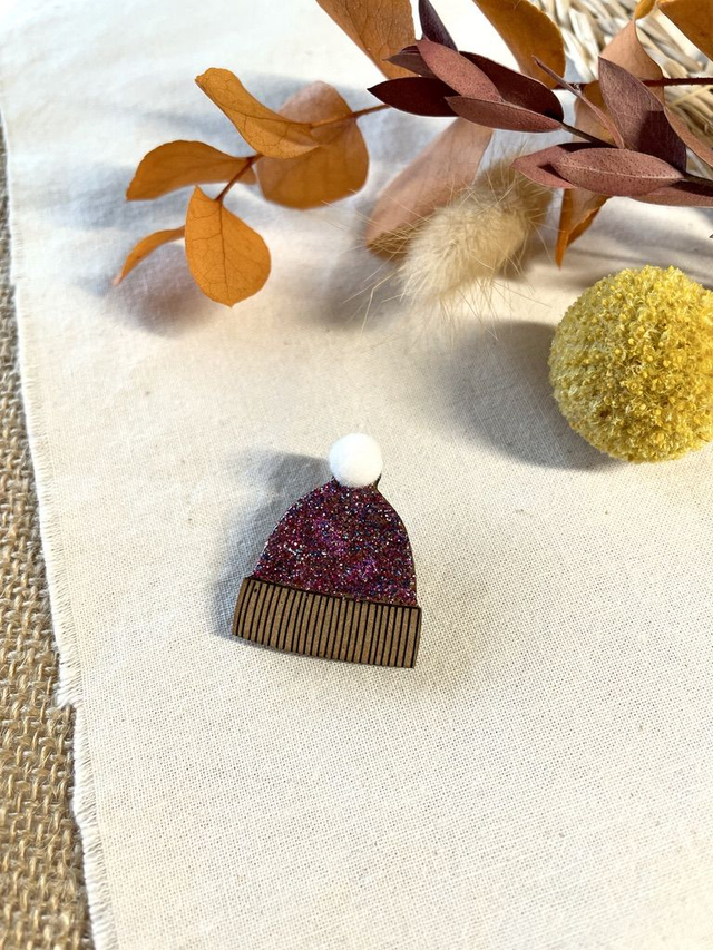Broche bonnet d'hiver en bois découpé et gravé au laser, décorée par de jolis papiers origami colorés.