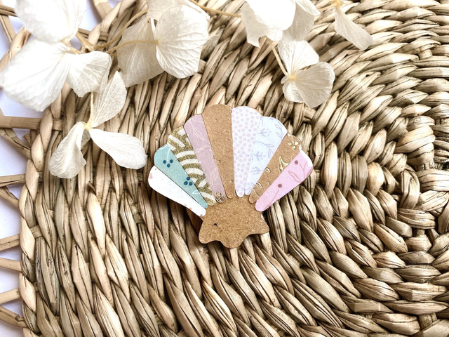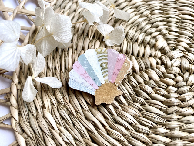 Cette broche coquillage est faite à partir d'une forme de coquille saint Jacques en bois, et d'un ensemble de papiers origami et décoratifs variés.
